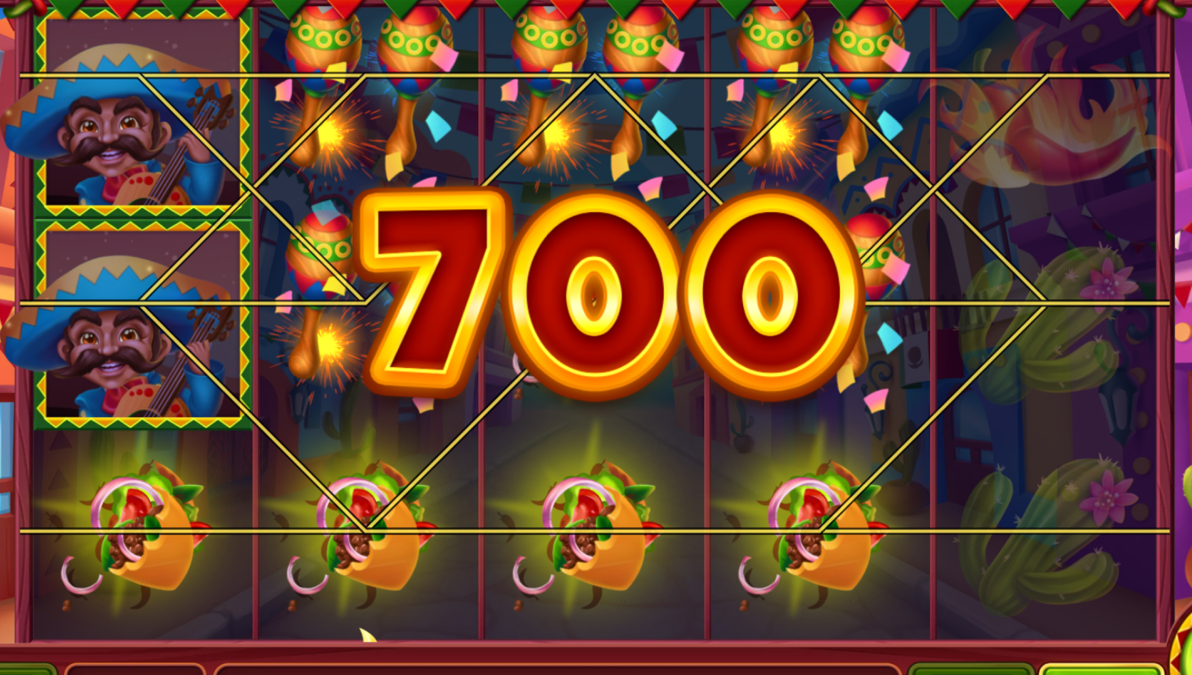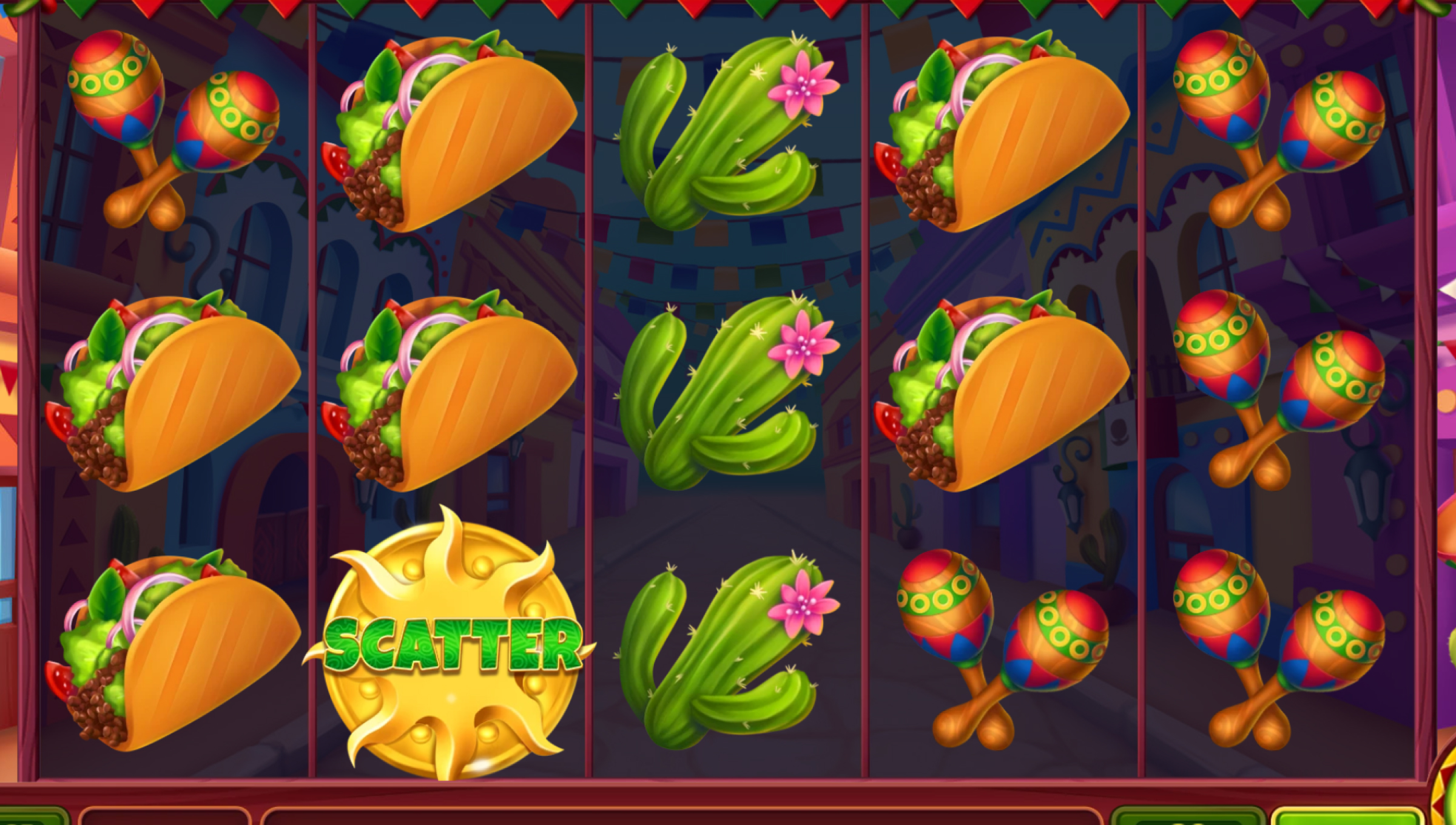 This is Mexico on a slot reel: tacos stuffed to the brim, tequila shots rimmed with salt and lime, maracas shaking, and guitars strumming. The background screams fiesta with colourful flags, neon streets, and flaming peppers lighting up the reels. The whole vibe is playful and bright — more street festival than high-roller Vegas.
