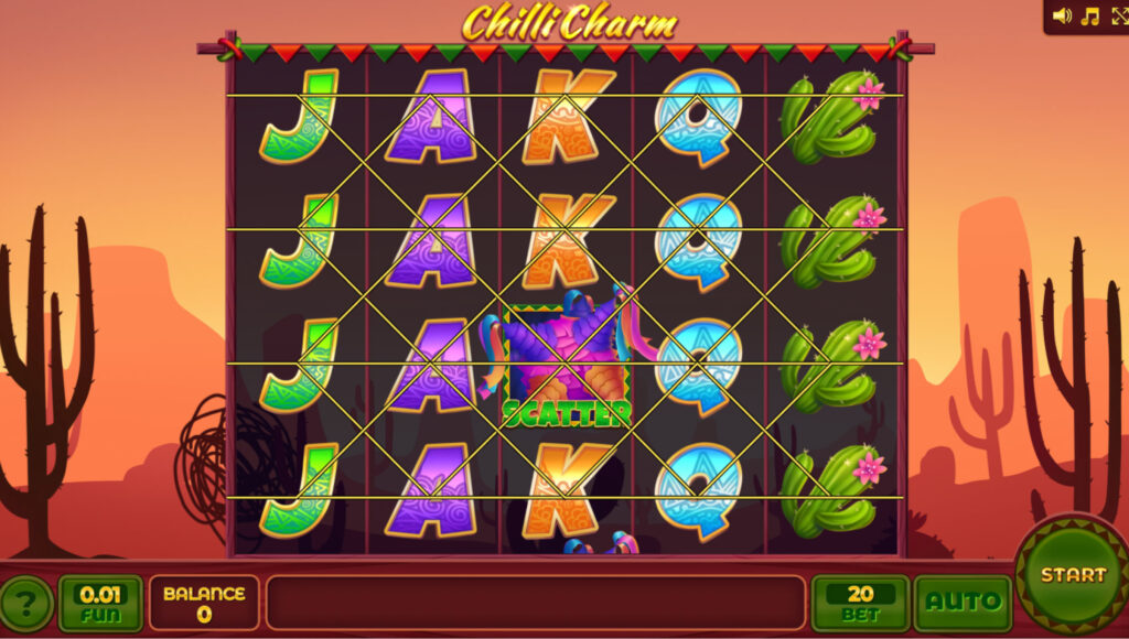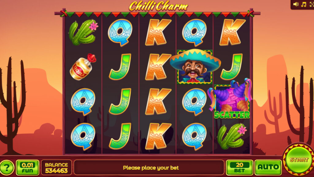 Chilli Charm hits instantly with its bold, desert-sunset palette: deep orange skies, tall cactus silhouettes, and reels packed with bright, fiesta-style symbols. Green cacti dotted with pink flowers sit beside colourful Q, J, A, and K icons, while the vibrant piñata Scatter steals the spotlight every time it lands. The whole setup feels lively and warm — like spinning in the middle of a small celebration.