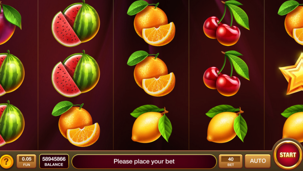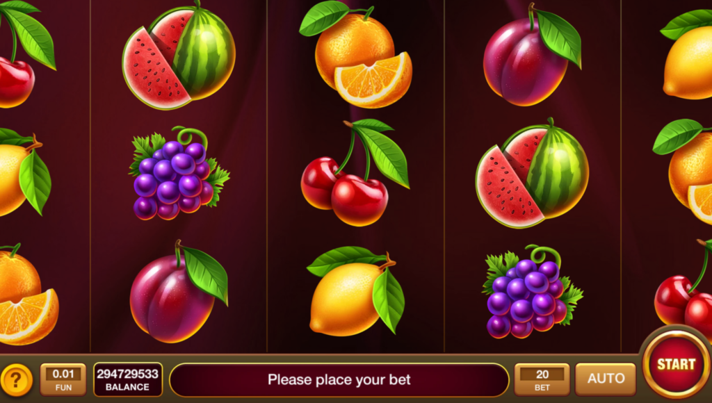 The fruit symbols are bright and sharply defined: cherries, grapes, lemons, oranges, watermelon slices. The contrast against the dark background keeps outcomes readable even during faster play.