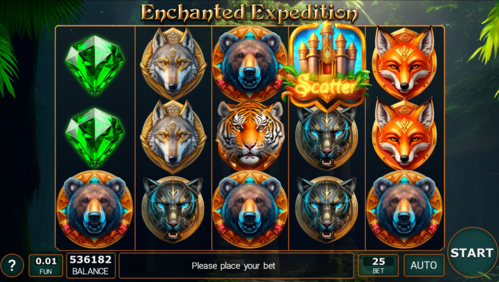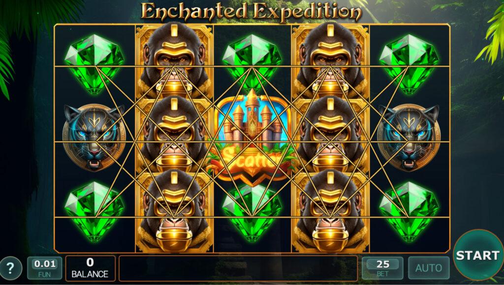 Enchanted Expedition invites players into a lush, glowing jungle where emerald crystals shimmer, golden gorilla masks guard ancient secrets, and a mystical castle stands at the heart of the reels. The game blends a classic slot feel with vivid fantasy artwork, creating an atmosphere that feels both adventurous and relaxing from the very first spin.
