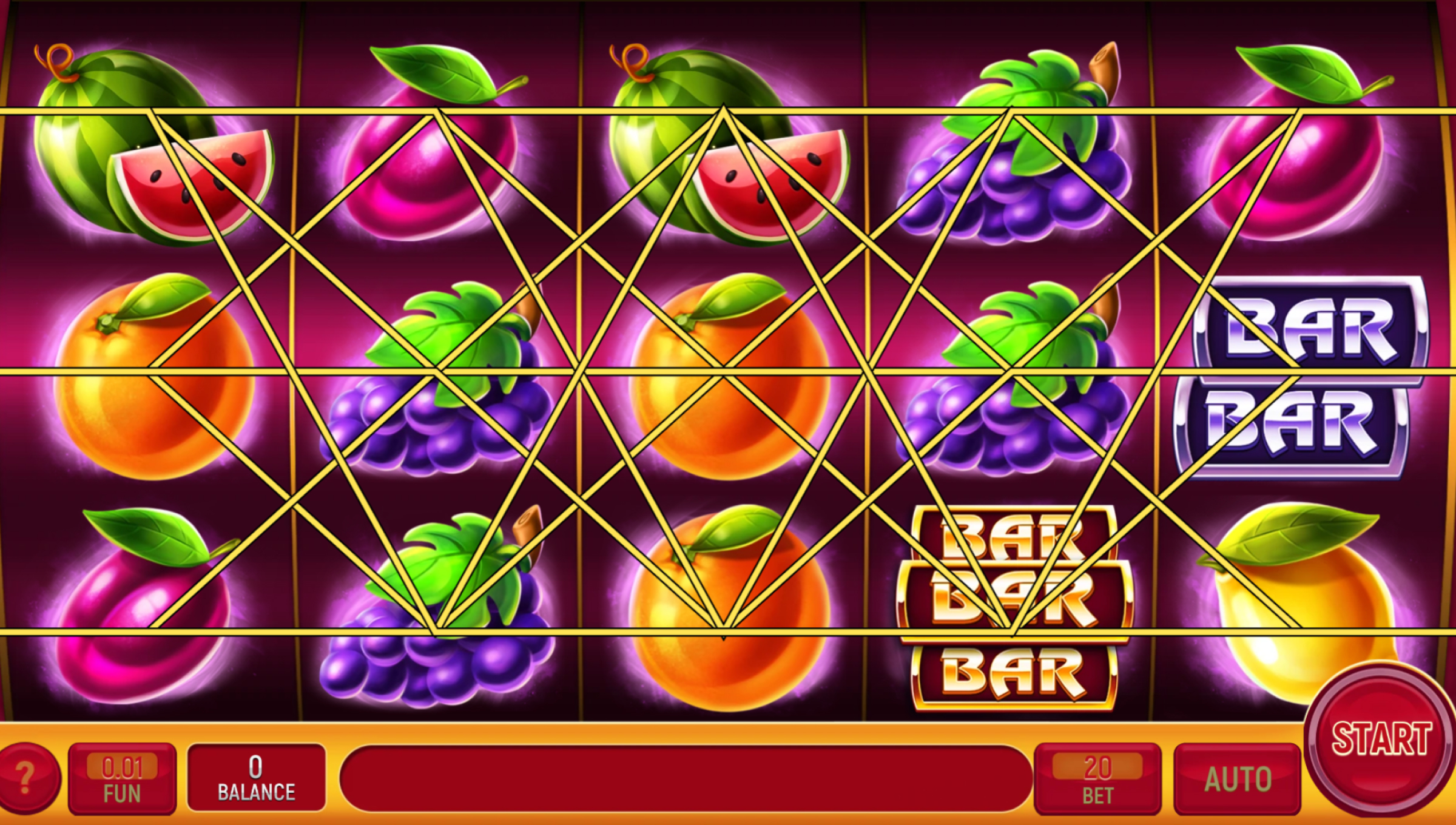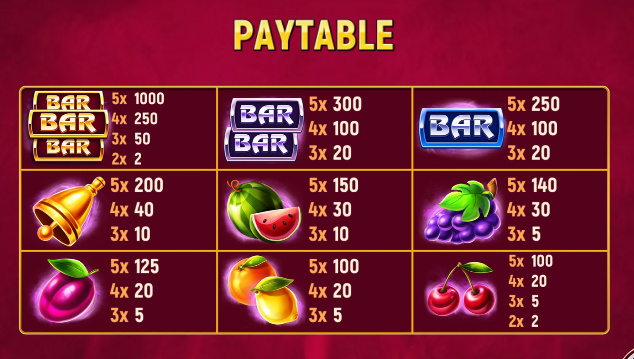 Grand Crown is a classic fruit slot with a clean, polished look — bright high-contrast fruits, gold-edged 7s, and a deep purple background that gives the whole board a casino-floor glow. It has that “simple but satisfying” feel: no layered bonuses, no mini-games, no traps — just pure spinning and the occasional reel-wide Wild moment that snaps your attention.