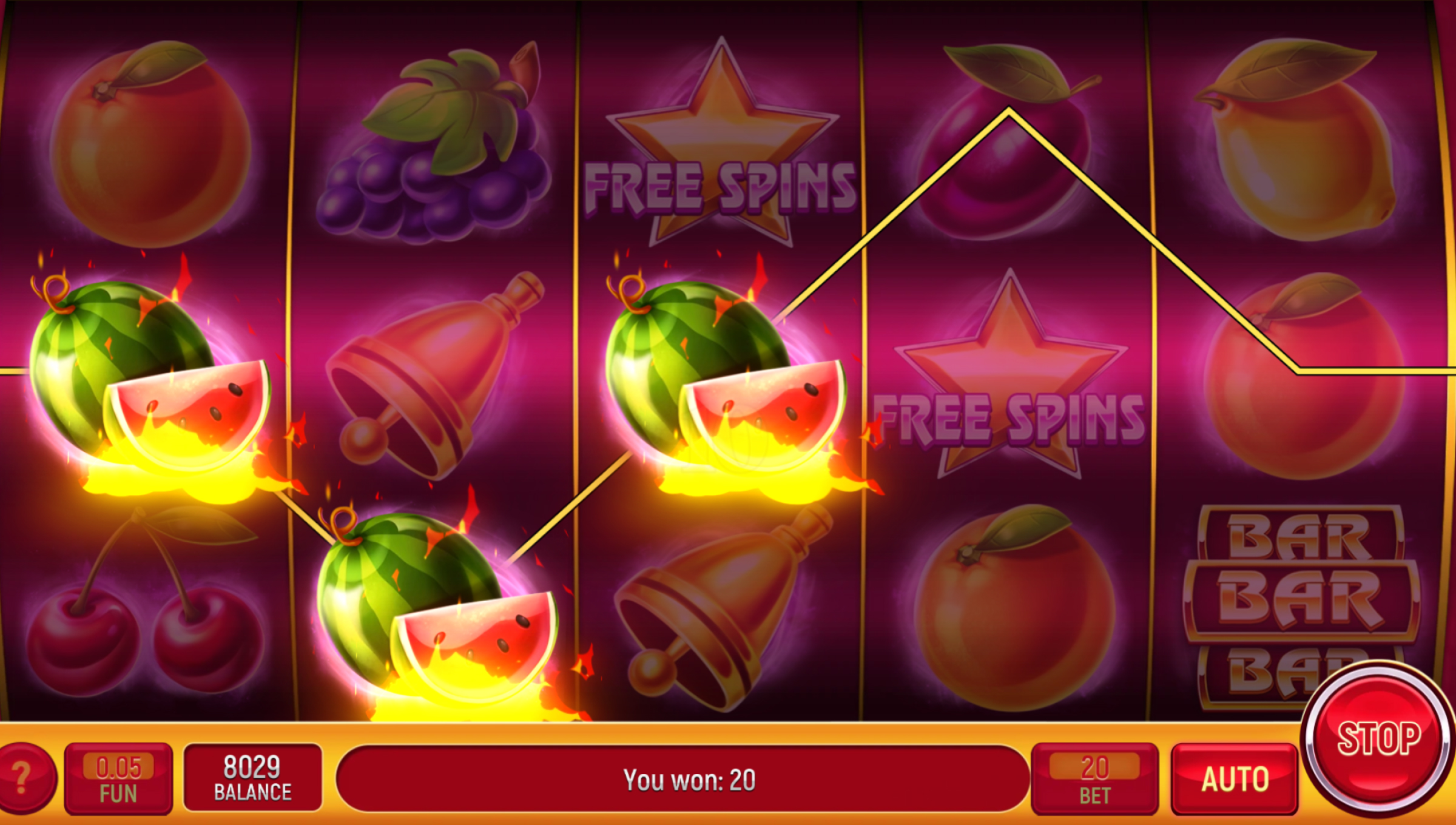 Tags: slot, free spins, low, 5 reels, 20 lines, fruits, scatter, wild
