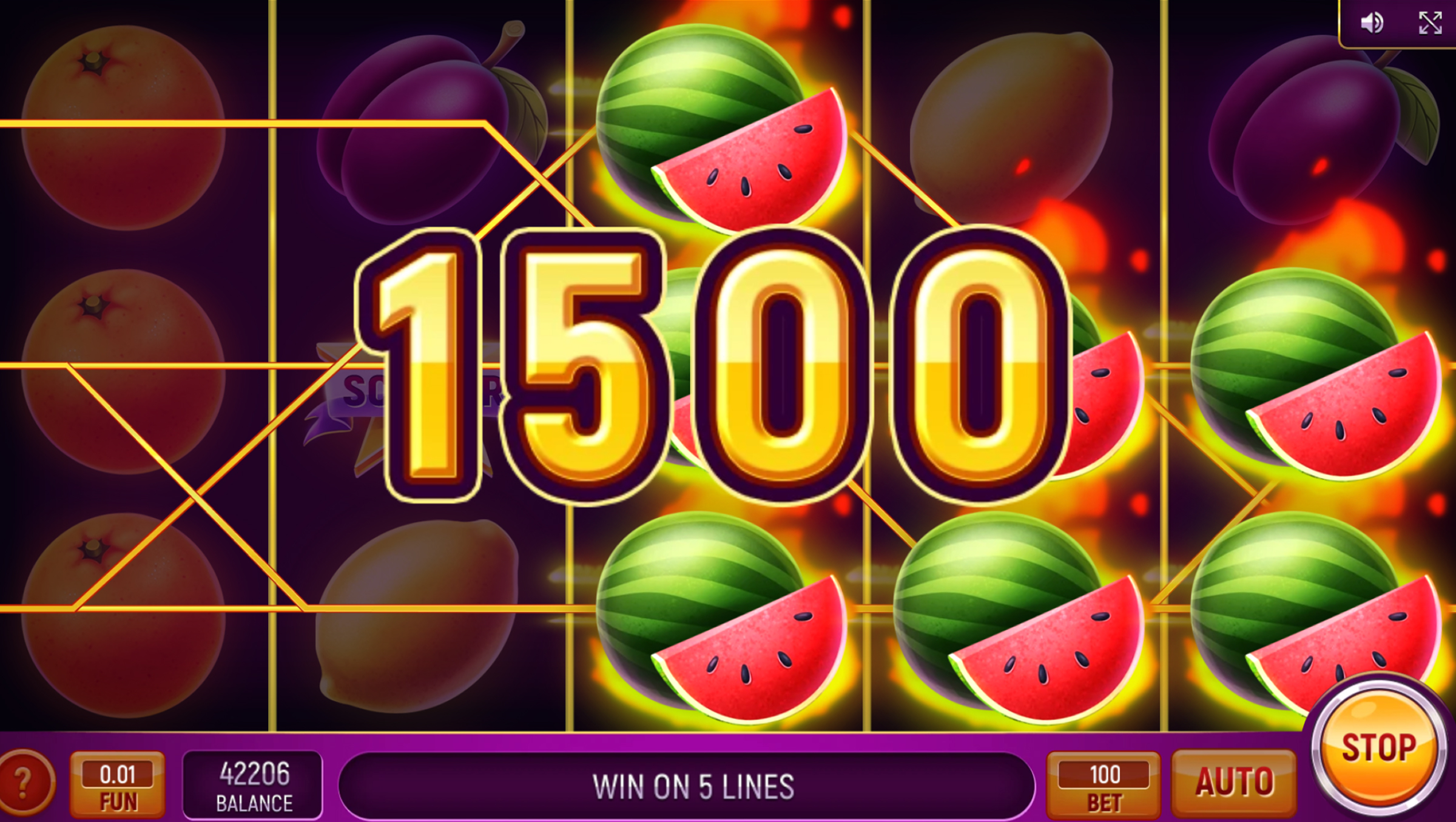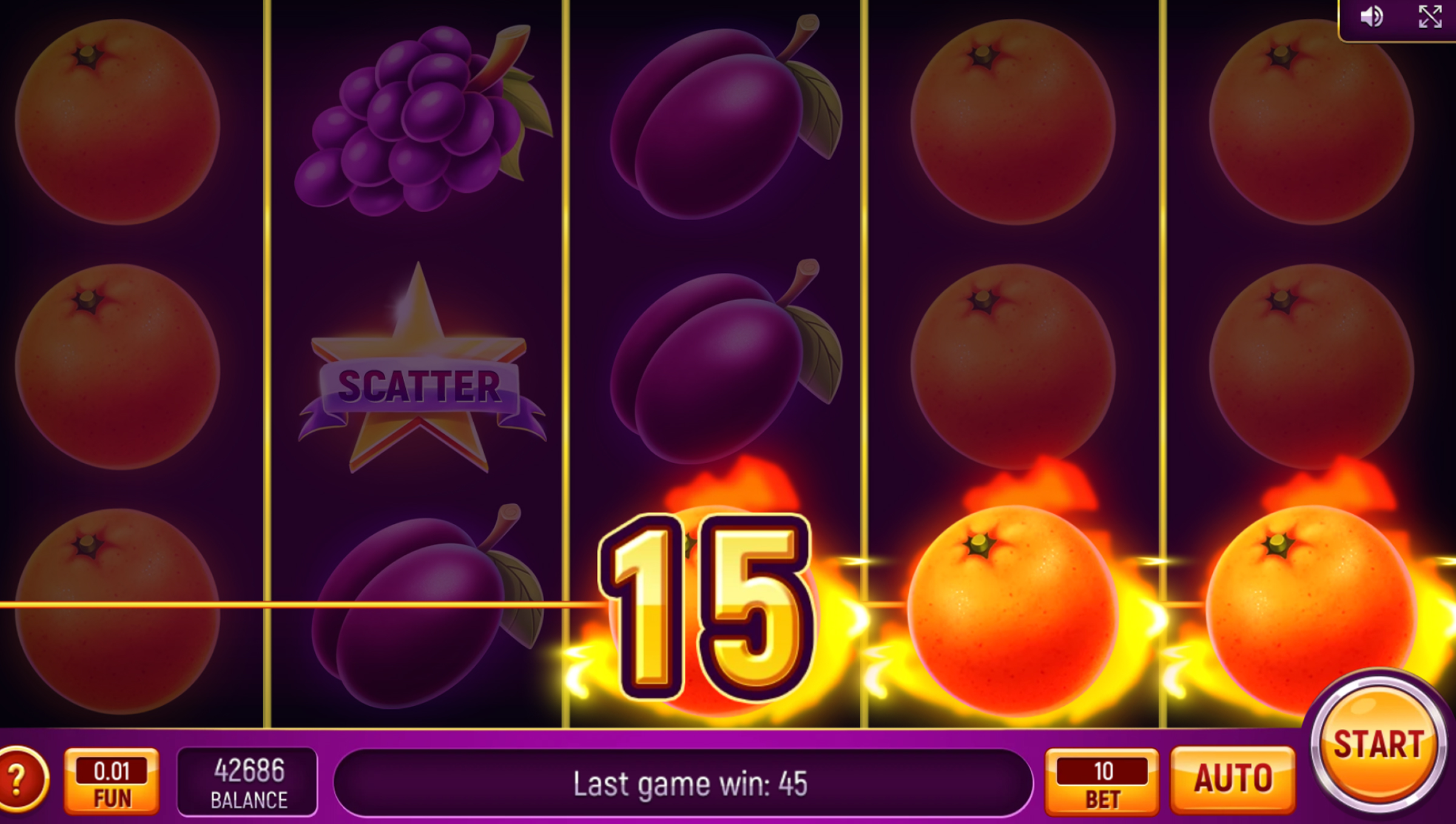 Fruit Bang is played on 5 reels with 10 fixed paylines, offering a clean and straightforward layout. It has high volatility, so wins may come in streaks rather than steadily, and with a hit rate of 15.83%, players can expect roughly one win every six or more spins.
