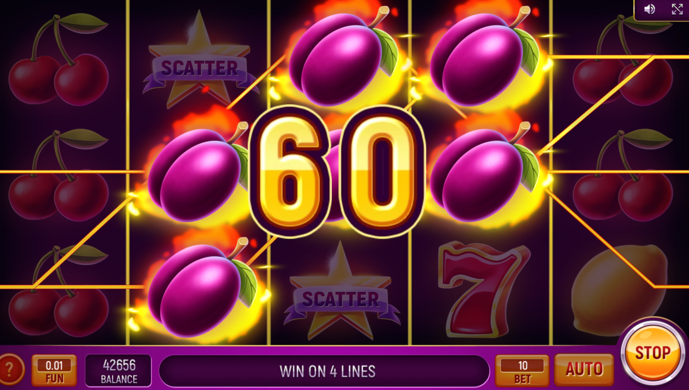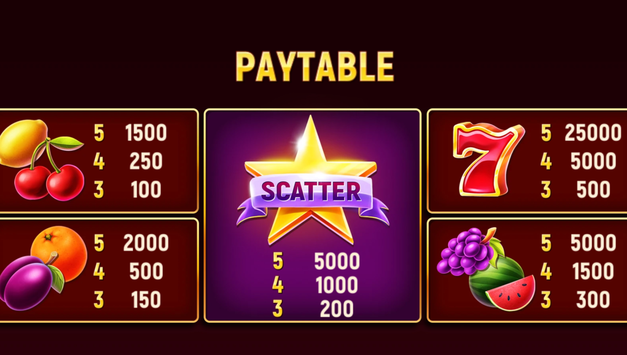 Fruit Bang is designed for players who enjoy building anticipation. Because of its high volatility, wins tend to come less frequently, but when they do, they can be noticeably larger. The hit frequency is relatively low, so patience — and a steady bankroll — are part of the experience. At the same time, the scatter symbol pays anywhere on the reels, which introduces unexpected, satisfying payouts that break up the usual line-based structure and keep the gameplay from feeling predictable.