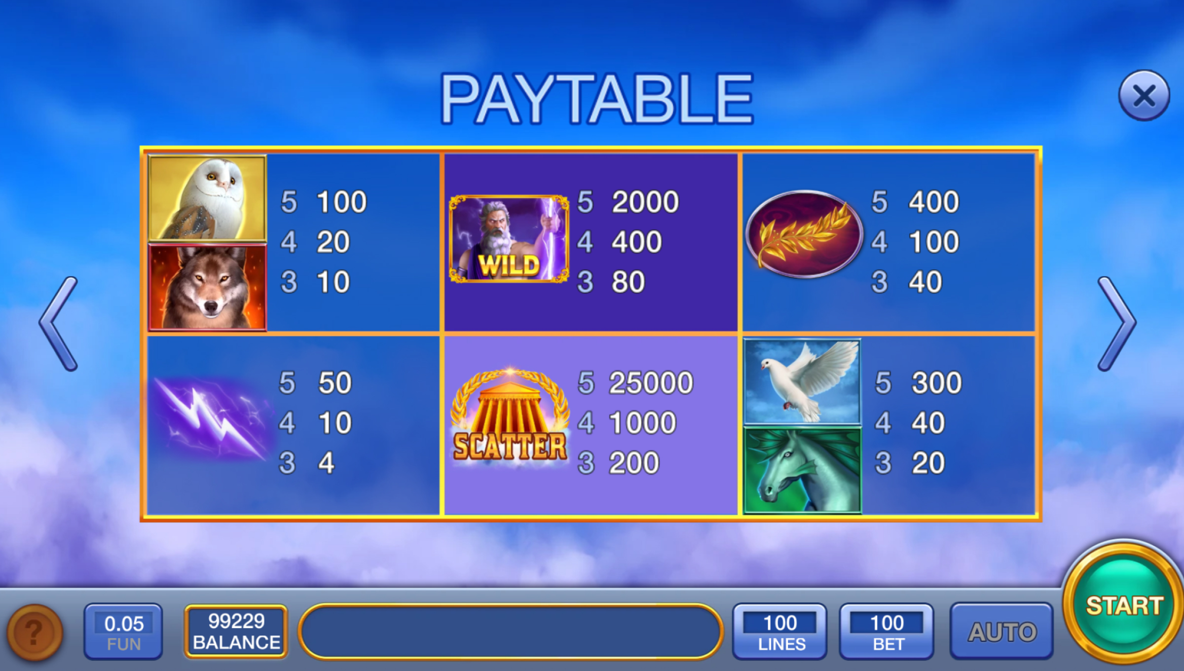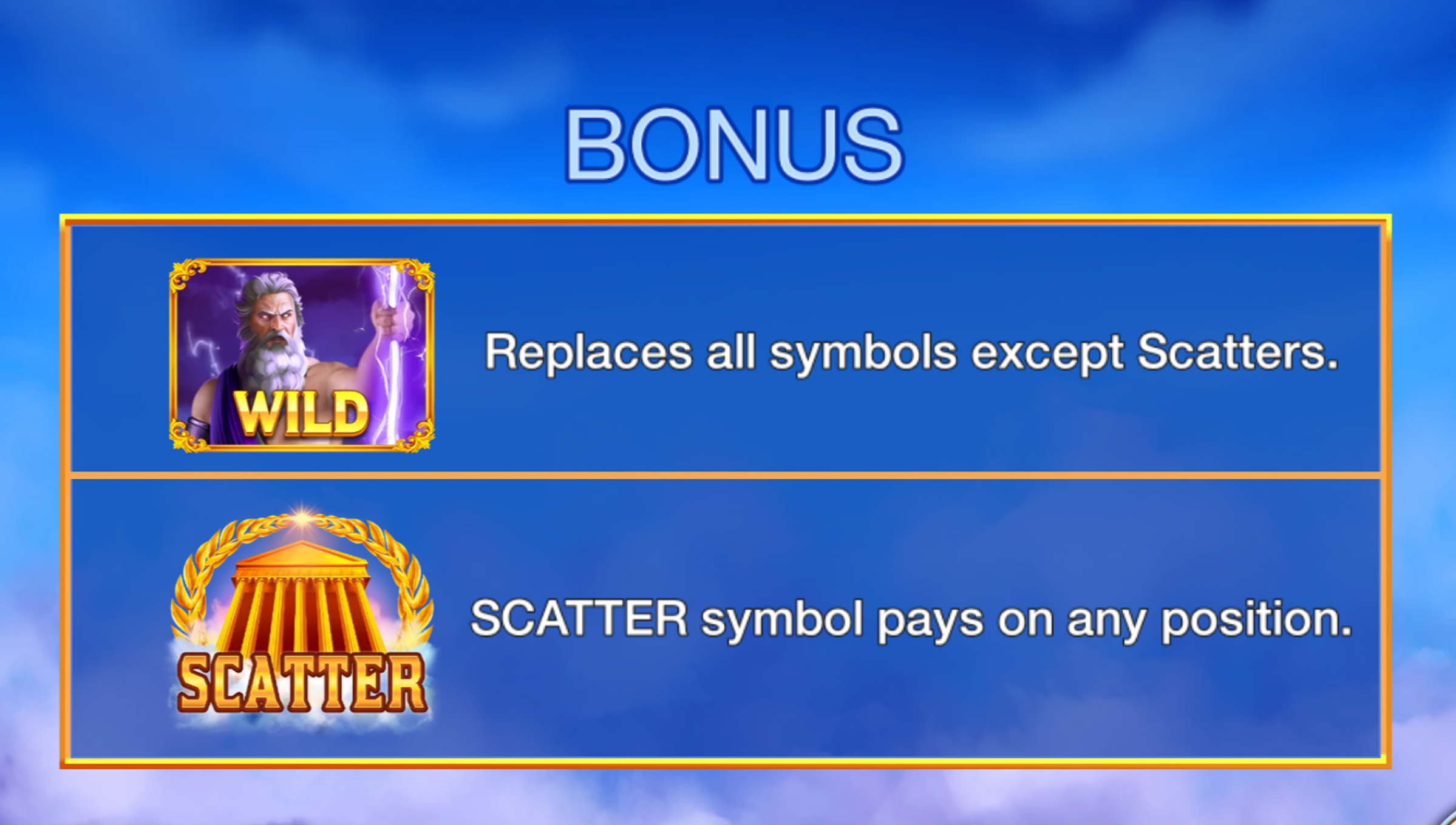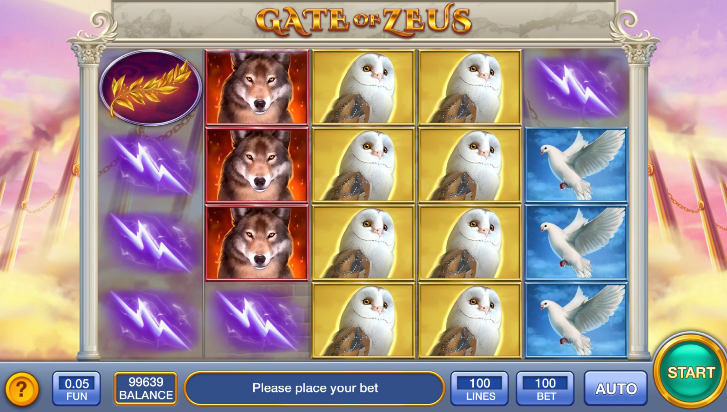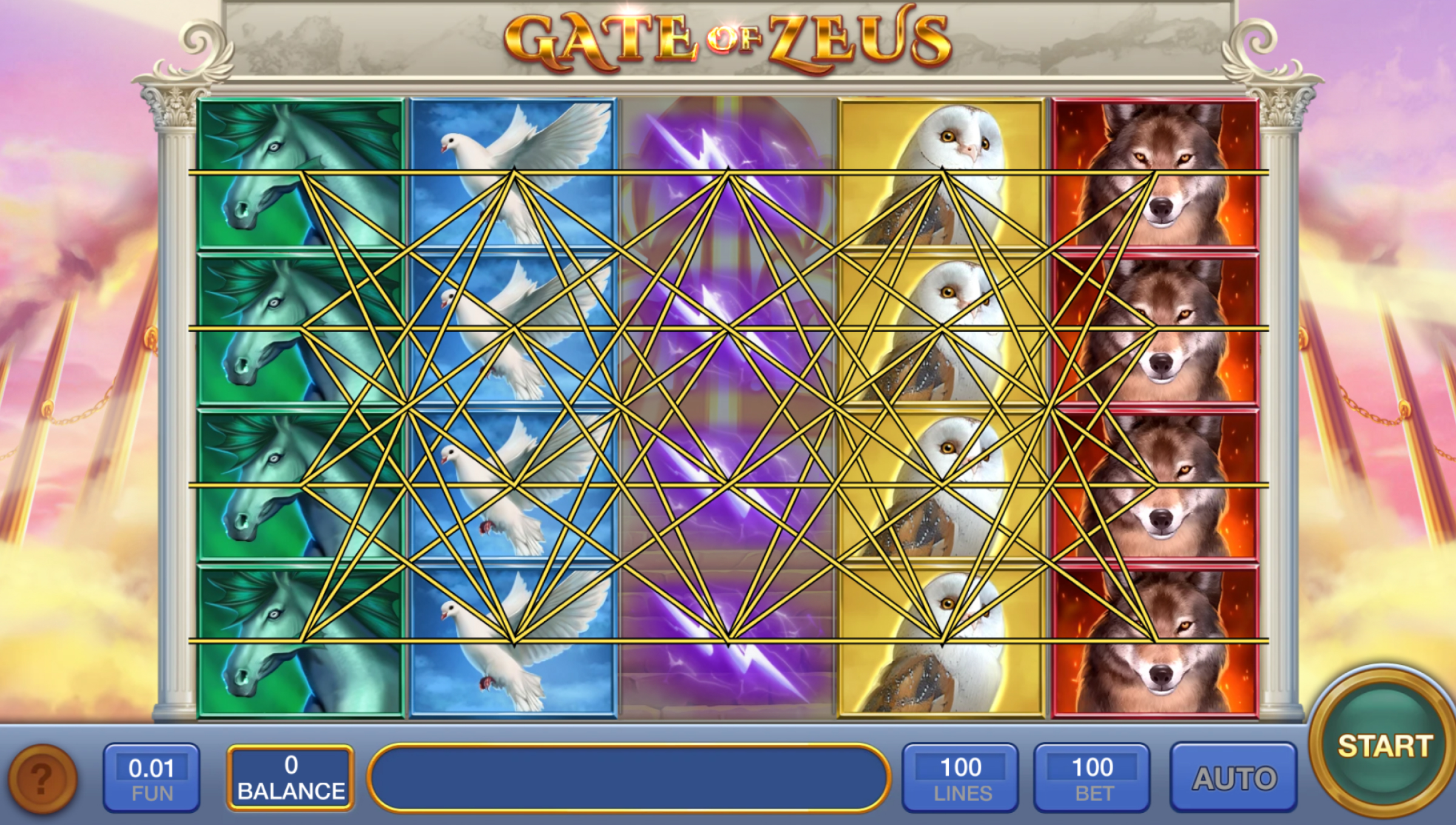 Gate of Zeus brings a soft, mythical Greek atmosphere — cloudy skies, marble pillars, white doves, winged horses, laurel wreaths, and bright lightning symbols across the reels. The tone is clean and airy rather than dramatic. You’re not here for overwhelming effects — you’re here for slow pacing, tension, and those moments when wins finally align across a big board.