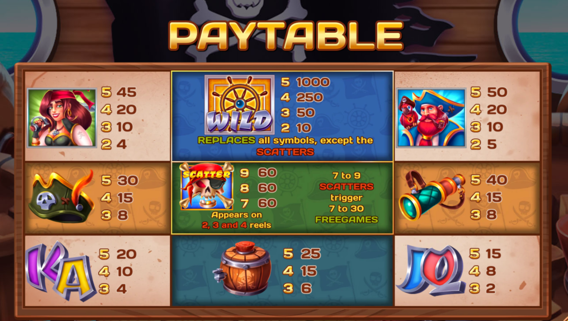 -Free Spins: 7 or more scatter symbols trigger free games. The number of spins depends on how many scatters land — 7 scatters = 7 free games, 8 scatters = 15 free games, 9 scatters = 30 free games. Free games use an alternative reel set and cannot be retriggered.