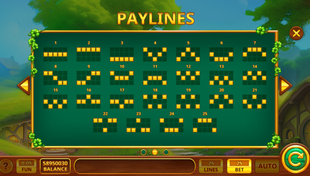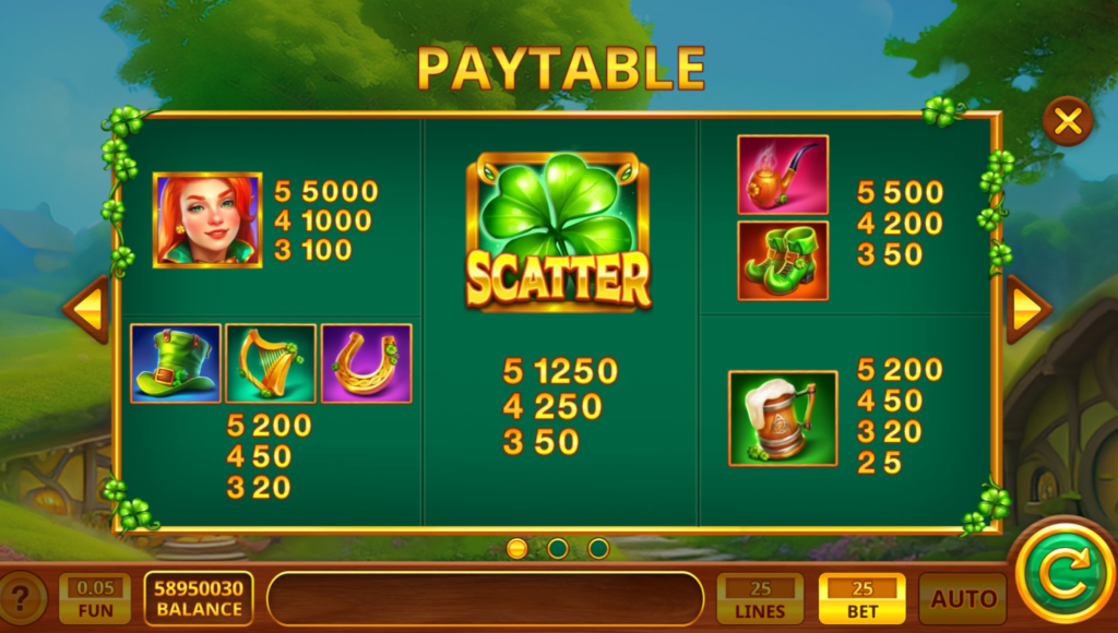 The grid is clean and old-school in the best way. 5 reels, 25 fixed lines, everything locked in place. No gimmicks, no shifting reels, no acrobatics. Just symbols snapping into position with that satisfying, mechanical confidence that says: we’re here to play properly. The colours are loud but not messy. Gold frames, deep greens, a harp that looks like it belongs in a proper tavern, and a foamy beer mug that practically dares you to chase the next spin.