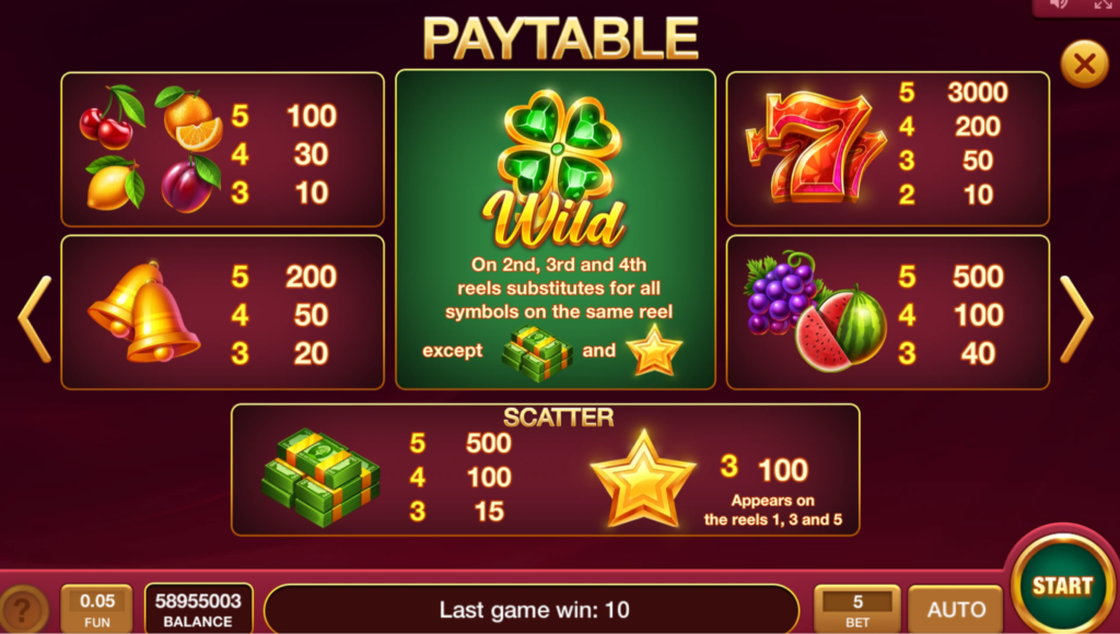 Wilds appear on reels 2, 3, and 4 and substitute for most symbols on the same reel, except the Money and Star icons.