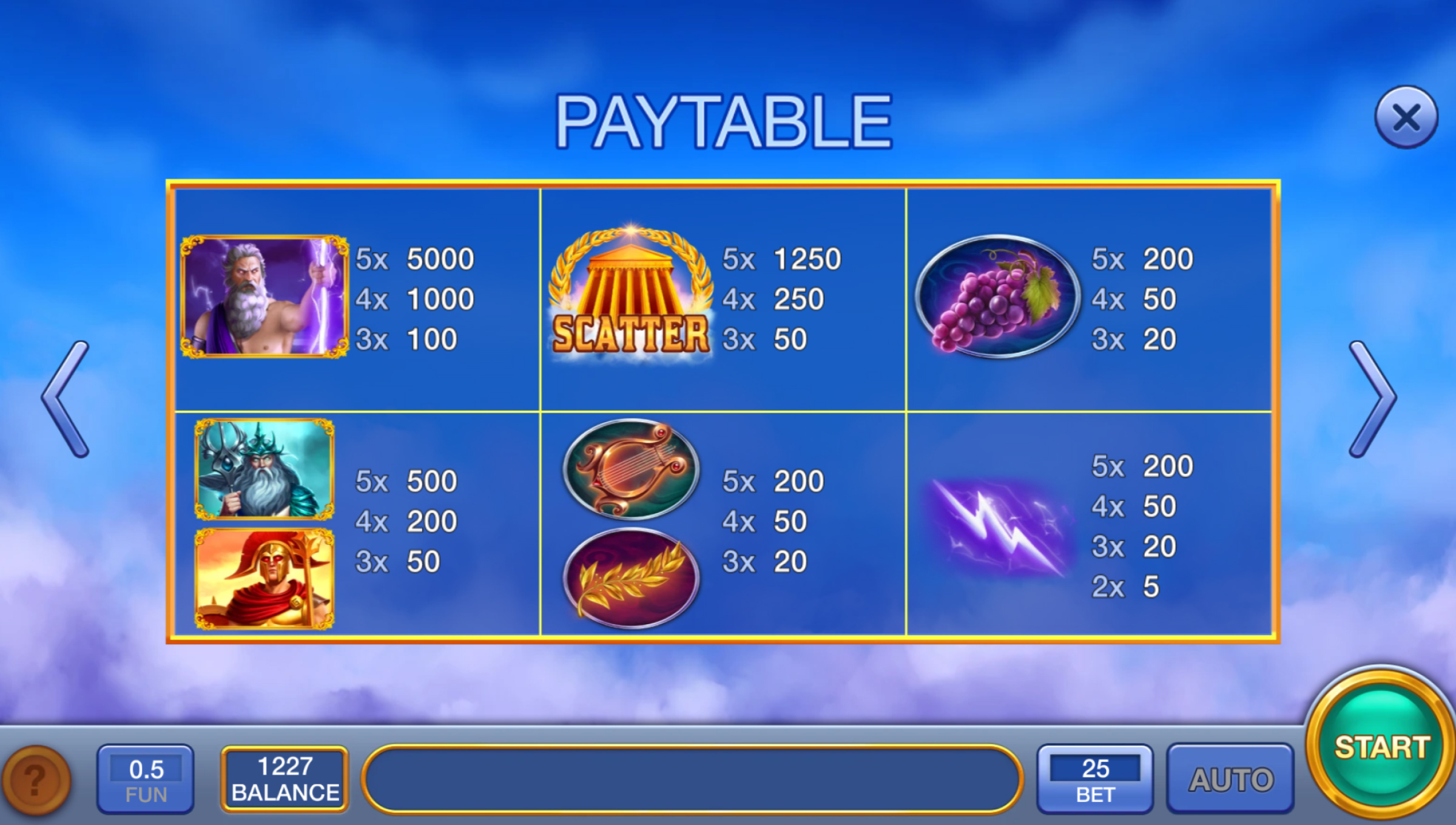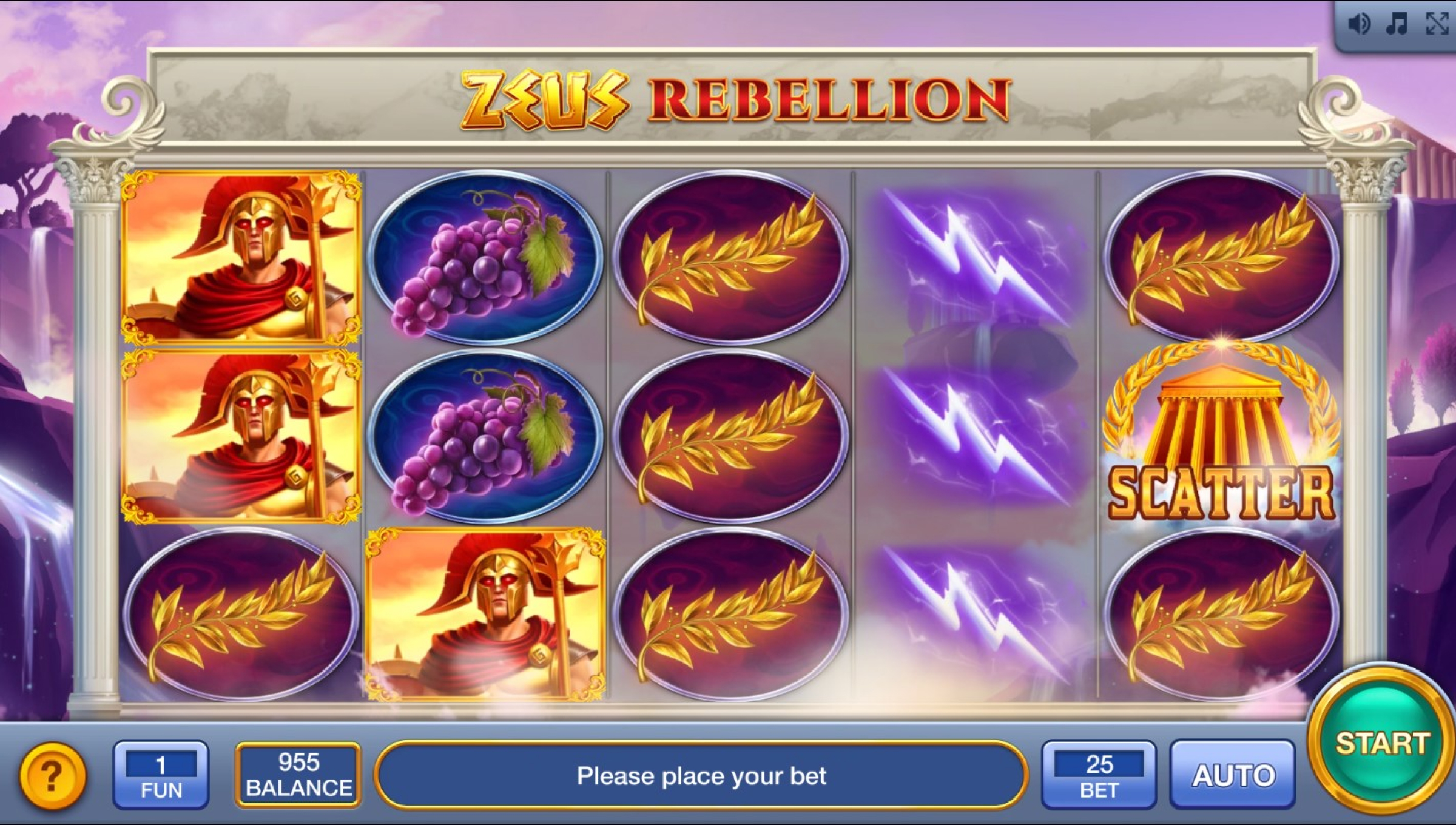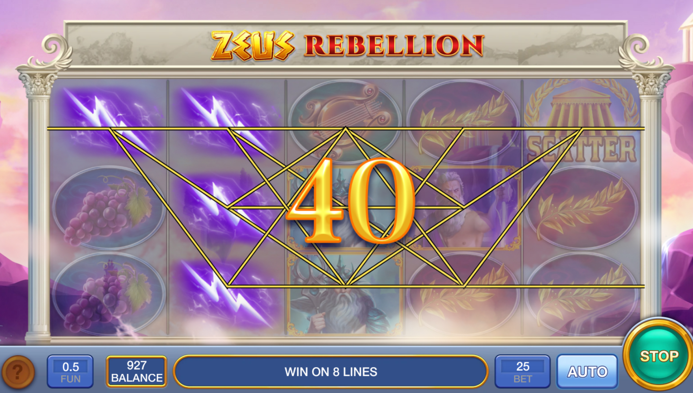 Zeus Rebellion runs on 5 reels with 25 fixed paylines, meaning your line structure stays consistent throughout play — no adjusting paylines, no tweaking grid behavior. The pacing is stable and clear: every spin is straight down the middle, no surprise modifiers, no sudden side mechanics.